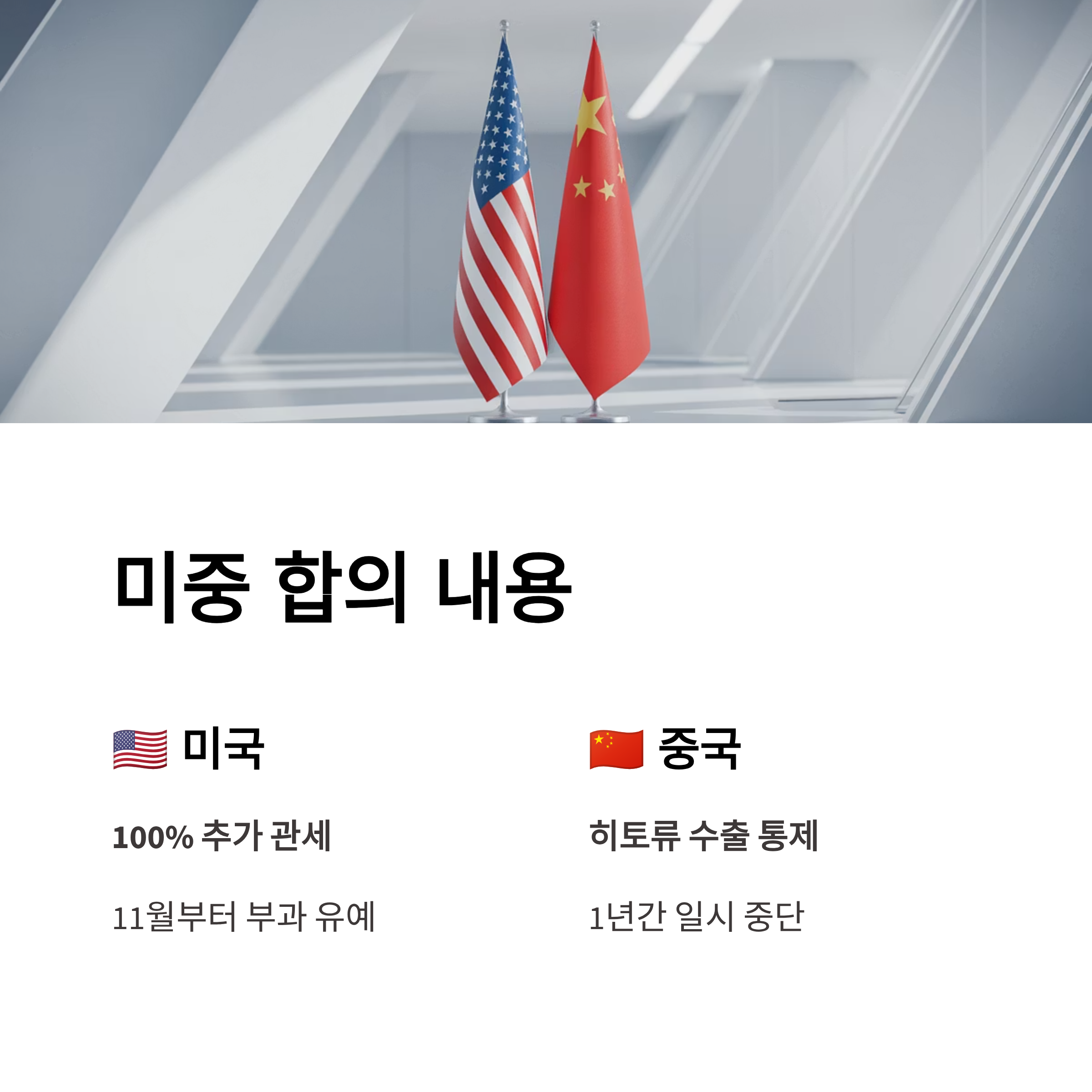2. 미국은 100% 추가 관세 부과를 11월부터 유예할 예정이며, 중국은 히토류 수출 통제를 1년 동안 일시 중단할 것을 합의.