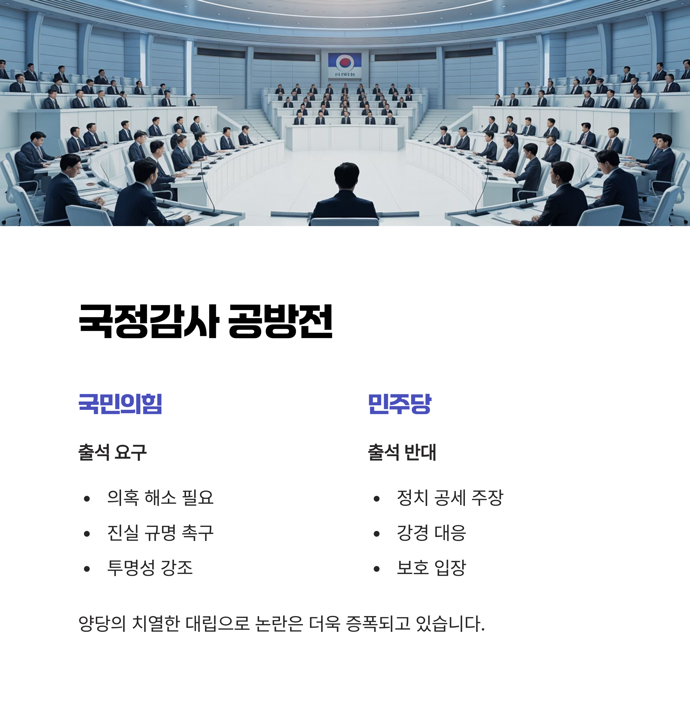 현재 국정감사 출석 여부가 정치적 논란의 핵심으로 부상 중입니다.